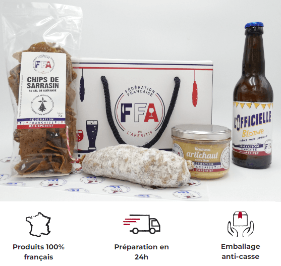 Dans cette composition, il y en a pour tous les goûts : une bière blonde artisanale, de la charcuterie, et des chips de Sarrasin.